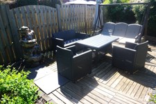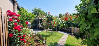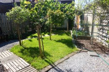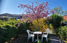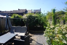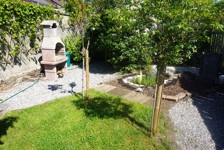 Terrain: terrasse et allée en klinkers emmurés (18m²), beau jardin d'agrément (+- 2 ares) divisé en 3 espaces (allée pavée, plan d'eau, fontaine, terrasse en bois, salon de jardin, arbres fruitiers, barbecue en dur).