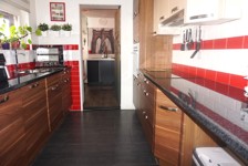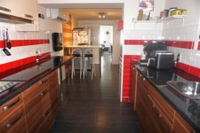 Rez: hall d'entrée (8m²) donnant sur la cour couverte (10m²), cuisine super-équipée avec espace repas (17m²) et plan de travail en marbre, arrière cuisine ou 2ème cuisine + réserve (9m²), buanderie (10m²) avec accès à l'extérieur, living avec arcade (30m²).