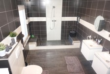 1er étage: hall de nuit (6,5m²) avec coin bureau, chambre 1 (21m²), chambre 2 (11,5m²), salle de bains entièrement carrelée (10m²) avec double évier, douche à l'italienne, wc suspendu.