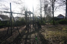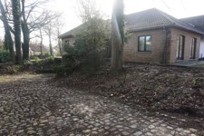 Terrain: allée en klinkers, allée latérale pavée carrossable et mitoyenne avec accès au garage, parterre avant, passage latéral avec barrière neuve, terrasse (41 m²) carrelée (joints à restaurer), jardin arboré et clôturé.