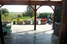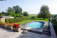 Terrain: à l'avant, espace parking en gravier, allée d'accès au garage, atelier (18m²), parterre avant et allée centrale, passage latéral carrossable en gravier avec portail en bois, terrasse (35m²) carrelée avec pergola et escalier en béton vers jardin arboré et clôturé avec piscine chauffée par une pompe à chaleur, douche extérieure, vue ouverte sur les champs.