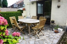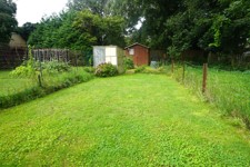 Terrain: passage latéral longeant les annexes à partir de la salle à manger, terrasse carrelée, beau jardin arboré et clôturé avec abri de jardin et potager en fond de terrain, garage non attenant avec porte sectionnelle et détecteur de présence à +-50m de la maison (L=6,6m; l=3m; H=2,3m).