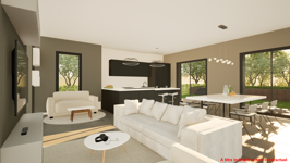 Rez: garage avec porte sectionnelle électrique et coin buanderie (22,22m²), hall d'entrée (4,18m²), wc indépendant (1,29m²), dégagement (2,64m²), living ouvert sur la cuisine (41,59m²).